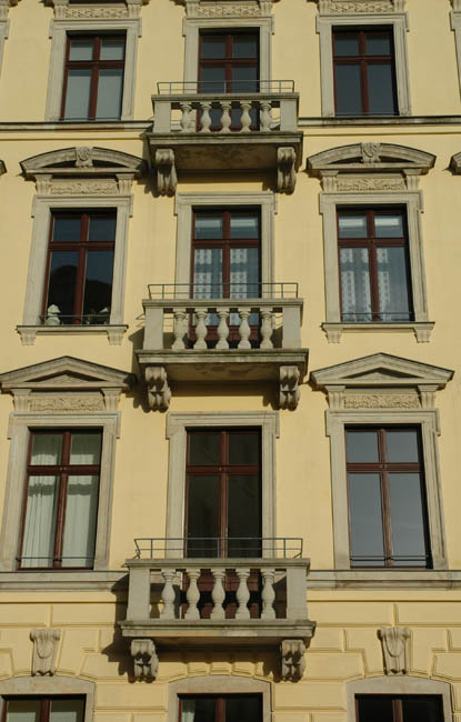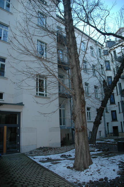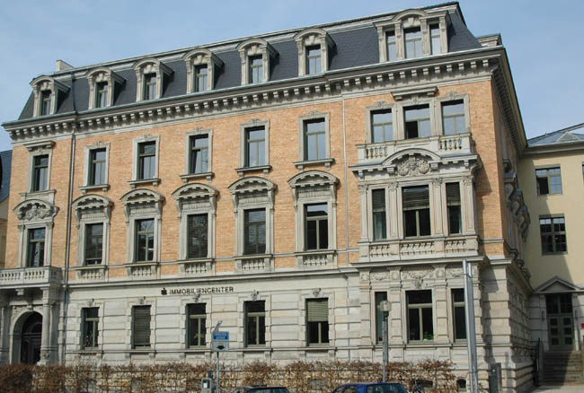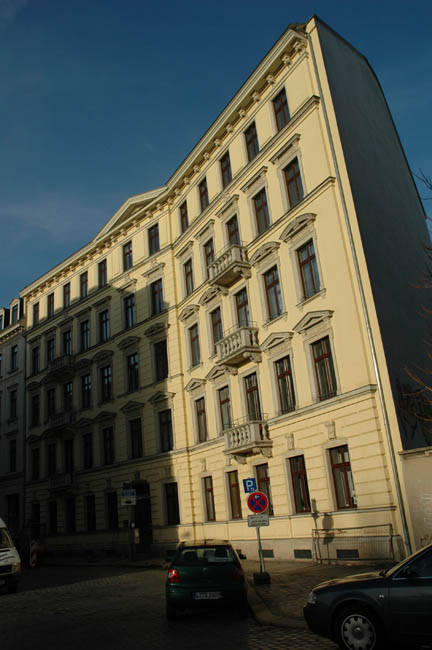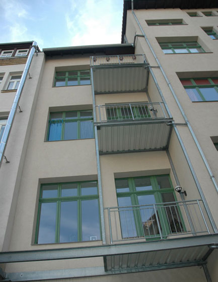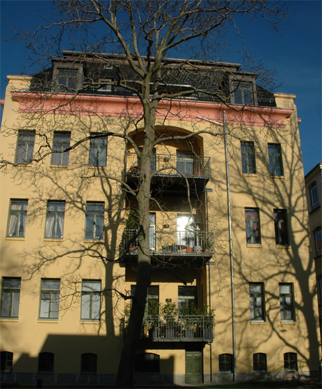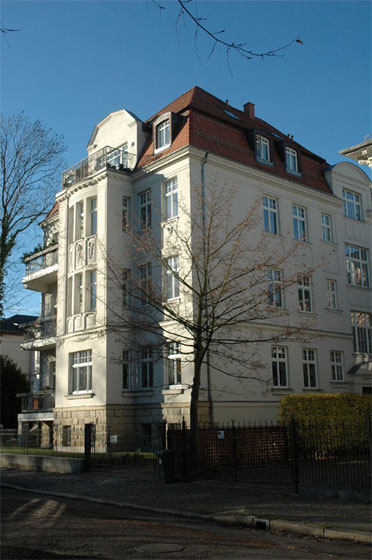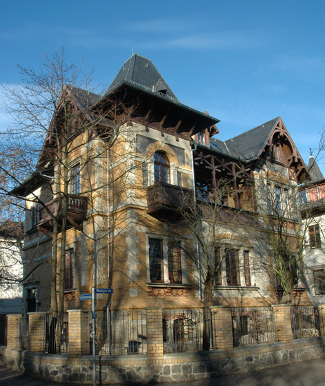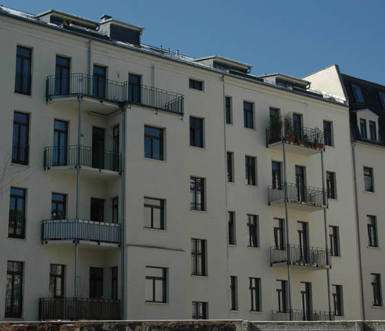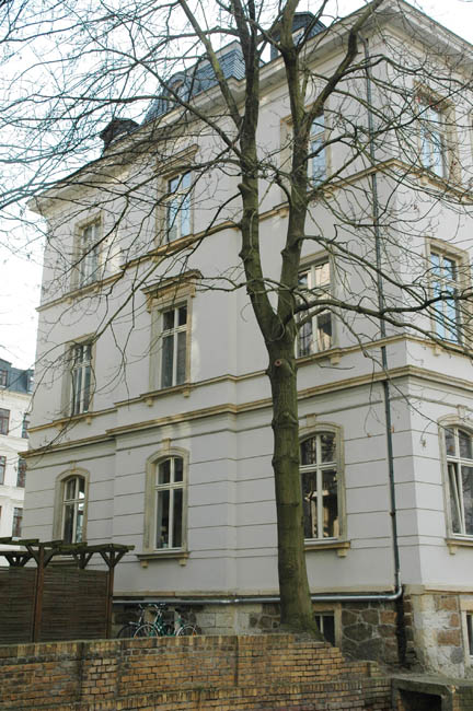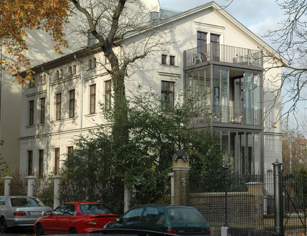 ...Wohnungsbau zwischen gründerzeitlichem Mietshaus und Villa. 1870 als Mietvilla errichtet, folgen zur Jahrhundertwende erste Modernisierungsmaßnahmen, denen sich Ende der 20er Jahre der Anbau eines Gebäudeflügels und weitere Instandsetzungsmaßnahmen anschließen. Im Laufe dieses Prozesses wurden Bauteile entfernt und der Putz als Glattputz erneuert. Mit der Sanierung des Baudenkmals wurde der Anbau zu großzügigen Wintergärten mit Dachterrasse umgebaut und die gründerzeitliche Architektur gewann an Dominanz zurück. Auf Rekonstruktionen am Außenbau wurde bis auf die Tür und die Erneuerung des Putzes als Glattputz verzichtet. Der Balkonanbau erhöht die Wohnqualität der im 1. und 2. Obergeschoss in ihren Grundrissen erhaltenen Wohnungen. Ausrichtung, Lage des Flurstücks und Erhalt der nach Norden weisenden Gebäudefront waren Argumente für die Anordnung der Balkonanlage.
