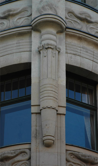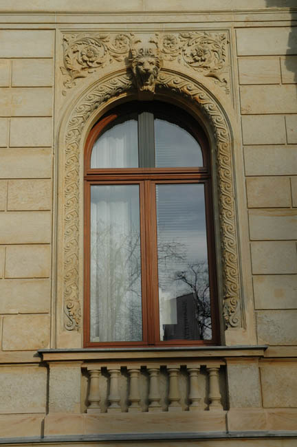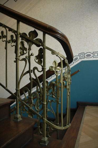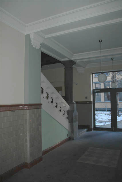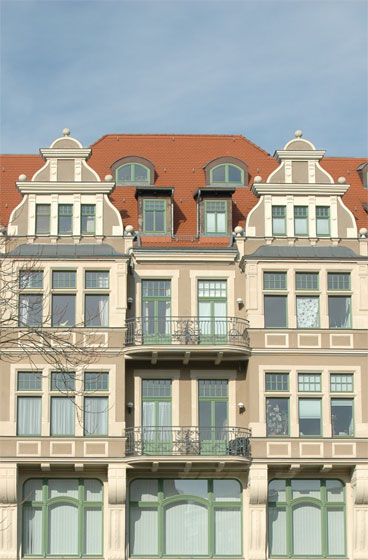 ...charakterisiert ein großes Vestibül, von dem sich die zur Straße gelegen Haupträume erschließen. Der Erhalt der Stuckdecken und der Zimmertüren trägt mit dem eindrucksvollen Treppenhaus und aufwendig instand gesetzten Wintergärten zur besonderen Wohnqualität des Baudenkmals bei. Die Vielfalt der Fensterprofilierungen der Gründerzeit und der Jahrhundertwende hat zu großen Fortschritten in der Produktion und einer Reduzierung der Kosten bei der Rekonstruktion historischer Fenster geführt. Besondere Bedeutung kam dem Erhalt der historischen Dachgauben, bei gleichzeitiger Gewährleistung des Rettungsweges und der Verbesserung der Lichtverhältnisse, des jetzt für Wohnungen genutzten Dachgeschosses zu.