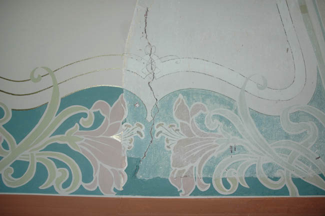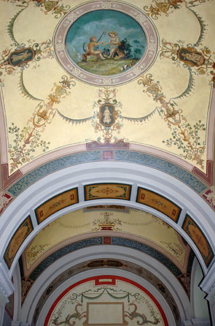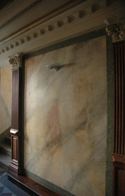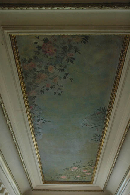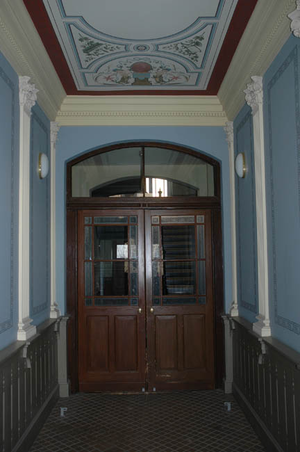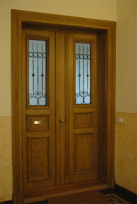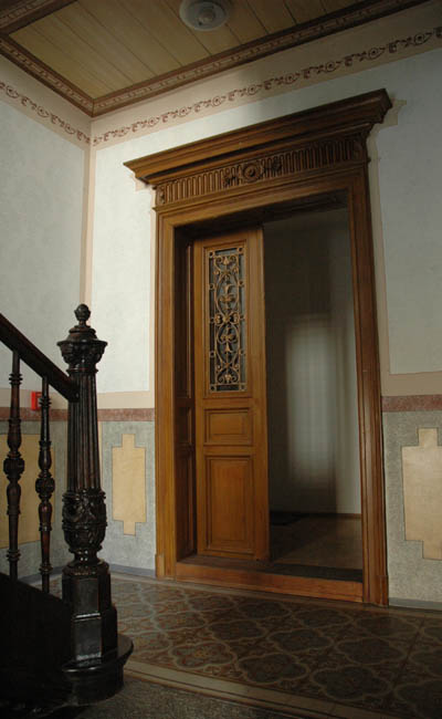 ...Ausmalung ist in den in ihrer ursprünglichen Größe erhaltenen straßenseitig gelegenen Wohnräumen eine besonders reich ausgemalte Stuckdecke hervorzuheben. Bauteile der architekturgebundenen Ausstattung, wie die Wohnungseingangstüren, wurden aufgearbeitet.