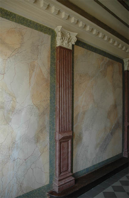 ... und Dachkonstruktion waren erheblich. Die am Original gemessene Rekonstruierbarkeit aller architektonischen Details ergänzt im Gebäudeinneren der erhaltene Grundriss mit den entsprechenden Türen und dem Parkett.