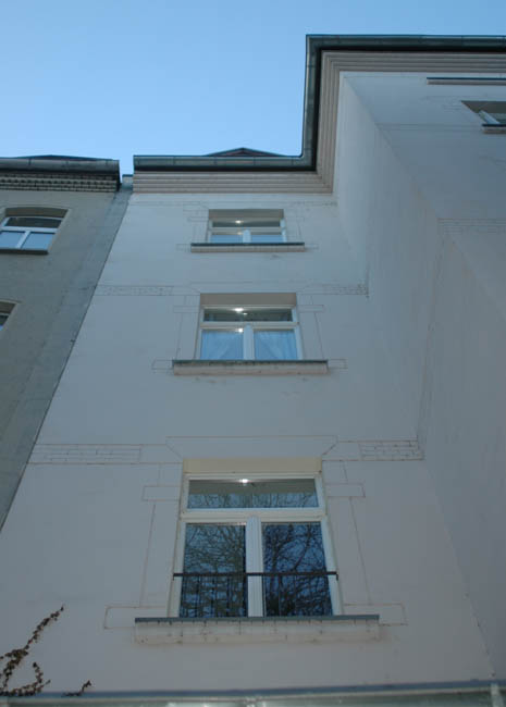 ...zeigt die regional verbreitete gelbe Klinkerarchitektur mit in Graffitotechnik gestalteten Putzspiegeln und eine vielgestaltige Dachlandschaft mit Ziergauben und Ziersprengwerk. Im Treppenhaus und der architekturgebundenen Ausstattung der Wohnungen sind Formen des Historismus erhalten. Die Realisierung der Dachgeschosswohnung stellte besondere Anforderungen. Dachkubatur und historische Dachgauben wurden erhalten und die Lichtverhältnisse verbessert. Darüber hinaus konnte eine das äußere Erscheinungsbild des Baudenkmals nicht beeinträchtigende Terrasse realisiert werden.