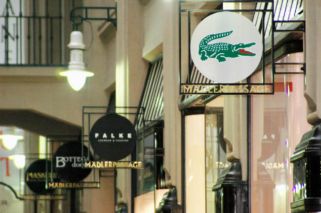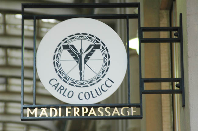 Werbung an einem Baudenkmal stellt den Antragsteller in der Regel vor besondere Anforderungen. Gesetzliche Vorgaben und Satzungen erschweren das Anbringen von Werbung wie den so genannten Nasenschildern. Genehmigungsgrundlage waren hier der Nachweis von historischen und modernen Nasenschildern in anderen denkmalgeschützten Passagen in Deutschland und Europa, das Design, das sich an der Bauzeit des Gebäudes orientiert, die in Proportionen, Material und Farbe auf die Passage abgestimmte Ausführung, die Freiheit der Werbung innerhalb des vorgegebenen Formats sowie deren gute Austauschbarkeit.
