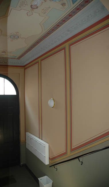 ...Ausmalung ist in den in ihrer ursprünglichen Größe erhaltenen straßenseitig gelegenen Wohnräumen eine besonders reich ausgemalte Stuckdecke hervorzuheben. Bauteile der architekturgebundenen Ausstattung, wie die Wohnungseingangstüren, wurden aufgearbeitet.
